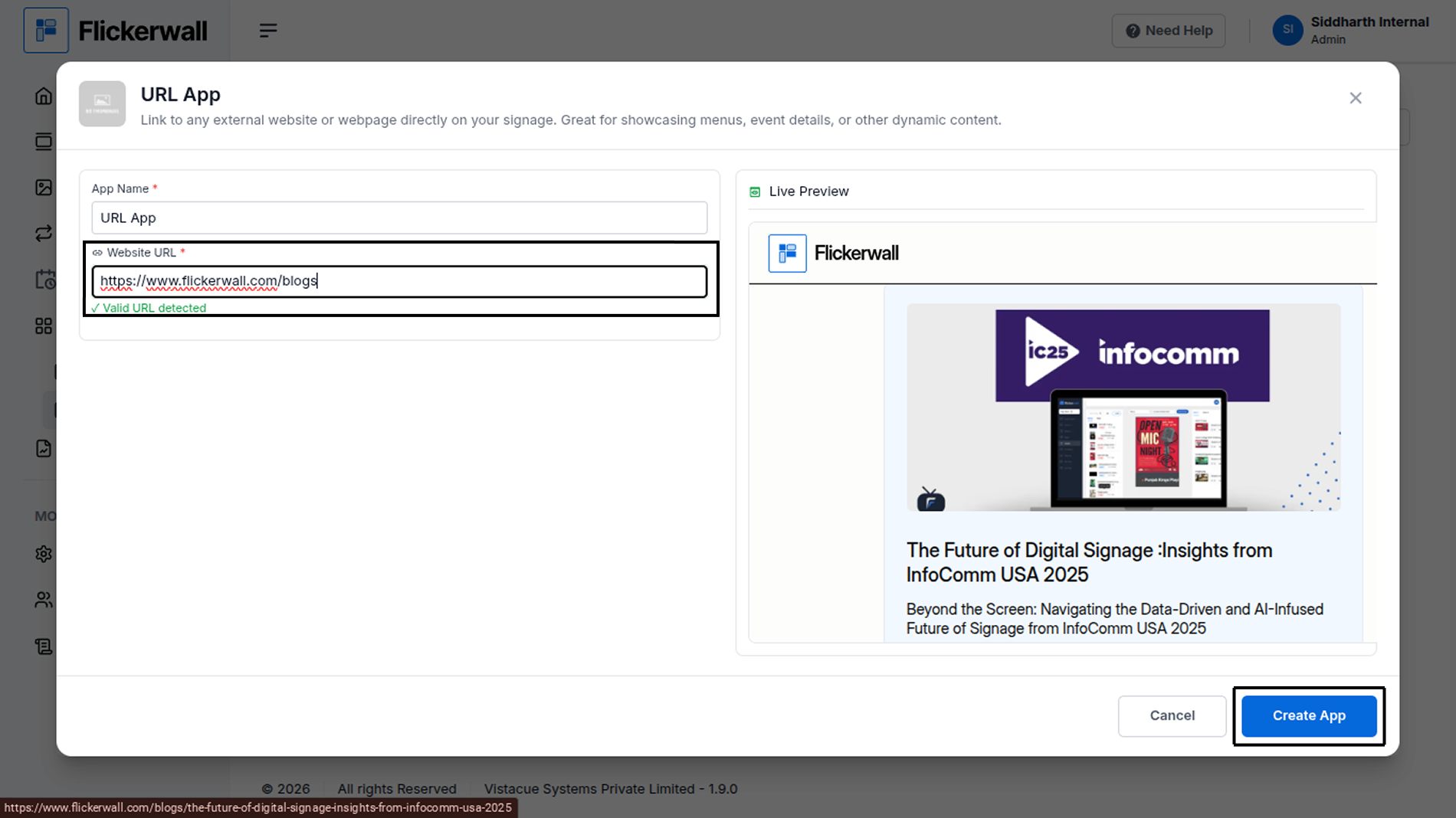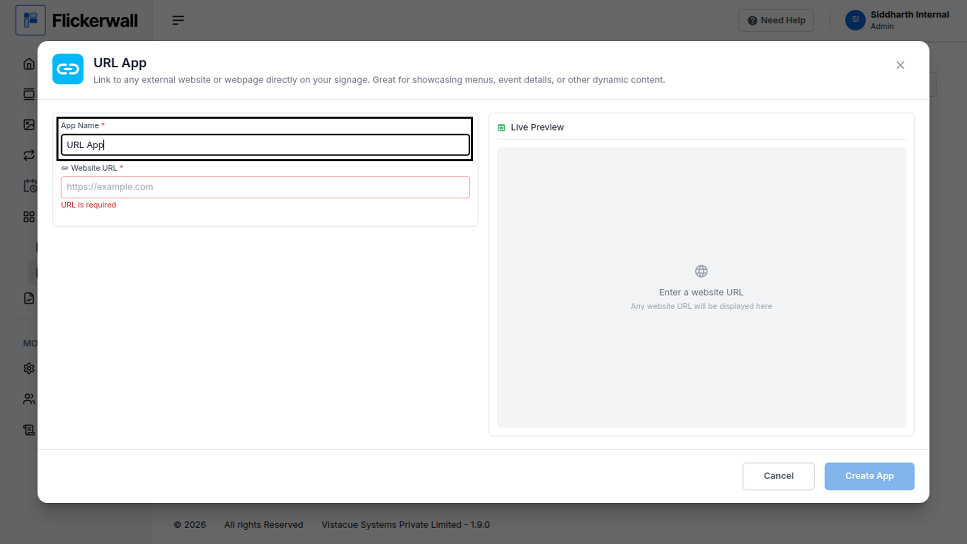 Step by step guide to learn how to add the URL app from the Flickerwall store