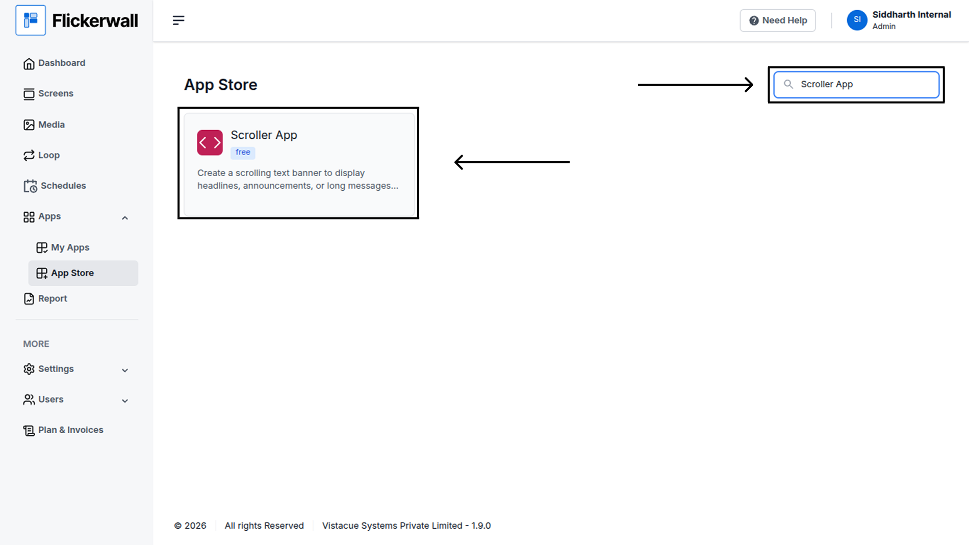 Step by step guide to learn how to add the Scroller app from the Flickerwall storeStep 1 Go to Apps and then App store! click on the apps and then Nevigate to App store in the appeared drawer