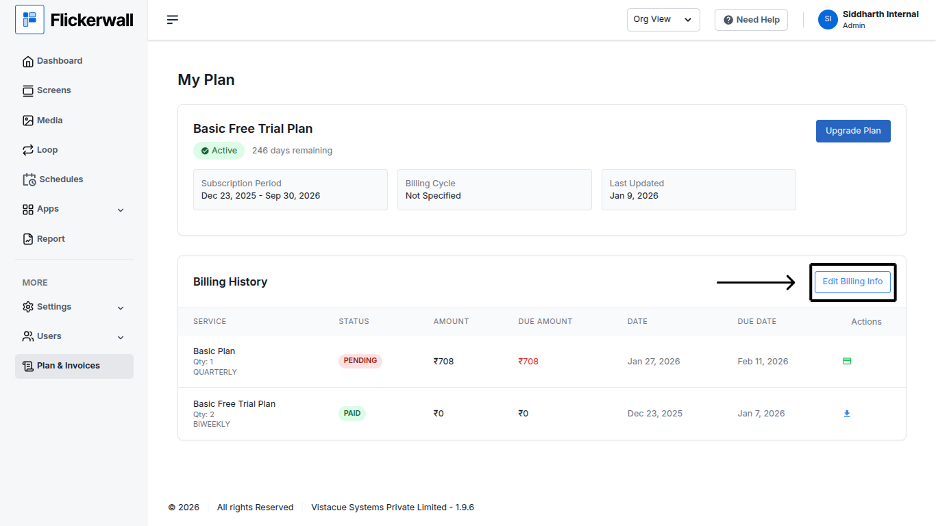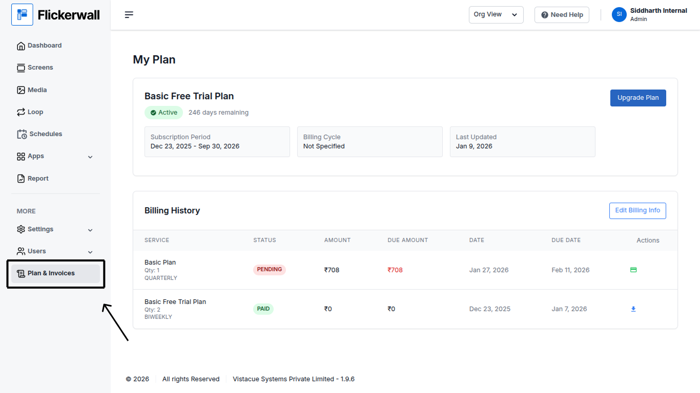 Learn how to Edit your Organization’s Billing details for better ManagementStep 1 Go to “Plan and Invoices” Module