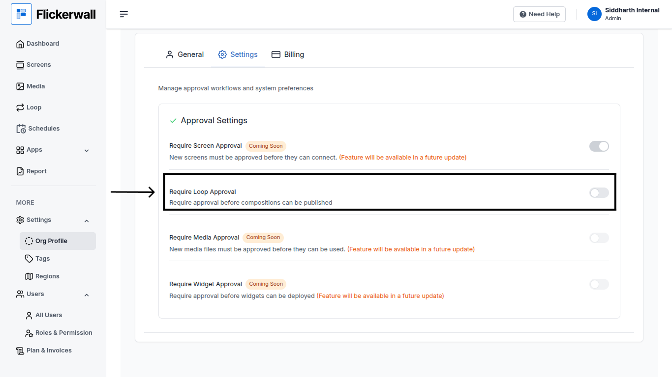 If you have many users connected, and you don’t want any Screens to Push / Publish any unauthorized loops. So simply turn this feature on and users other than Admin can’t Push or Publish any new Loops unless they are Approved by the Admin. In Short You Take Control Of Your Screens !